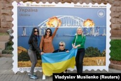 В Киеве установили макет почтовой марки с горящим Крымским мостом