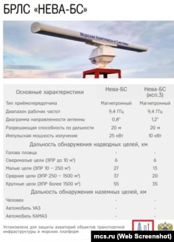 На сайте "МКиС" размещен каталог продукции, в котором радиолокационная система "Нева-БС" сфотографирована на одной из буровых установок "Черноморнефтегаза". Радар может обнаруживать крупные надводные цели на расстоянии до 55 километров. В комментарии к описанию "Невы-БС" в каталоге написано: "Установлена для защиты акваторий объектов транспортной инфраструктуры и морских платформ", рядом с этой фразой размещены два логотипа – Минтранса России и "Черноморнефтегаза".