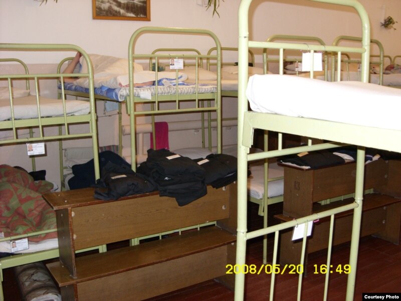 Это – спальное помещение (“жилая секция” по-другому) отряда в колонии в самом городе Архангельске, снимок опять же не разоблачительный, а как раз наоборот - рекламный. Обратите внимание на расстояние между койками – оно маленькое потому, что по нормам (это вам ТТ подробно разъяснит) на каждого должно приходиться 2 квадратных метра. Когда к нам в колонию ехал с проверкой директор ФСИН Реймер, прихвативший зачем-то ещё и группу общественников, из которых я лично с интересом познакомился с полковником ФСБ, наш отрядник напечатал на принтере большую красивую табличку -”200 кв. м”.
